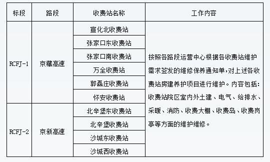 2.4招標(biāo)范圍:京藏、京新、張石、二秦高速路段收費站日常養(yǎng)護項目養(yǎng)護準(zhǔn)備期、養(yǎng)護期、竣(交)工驗收、缺陷責(zé)任期的全部相關(guān)工作。